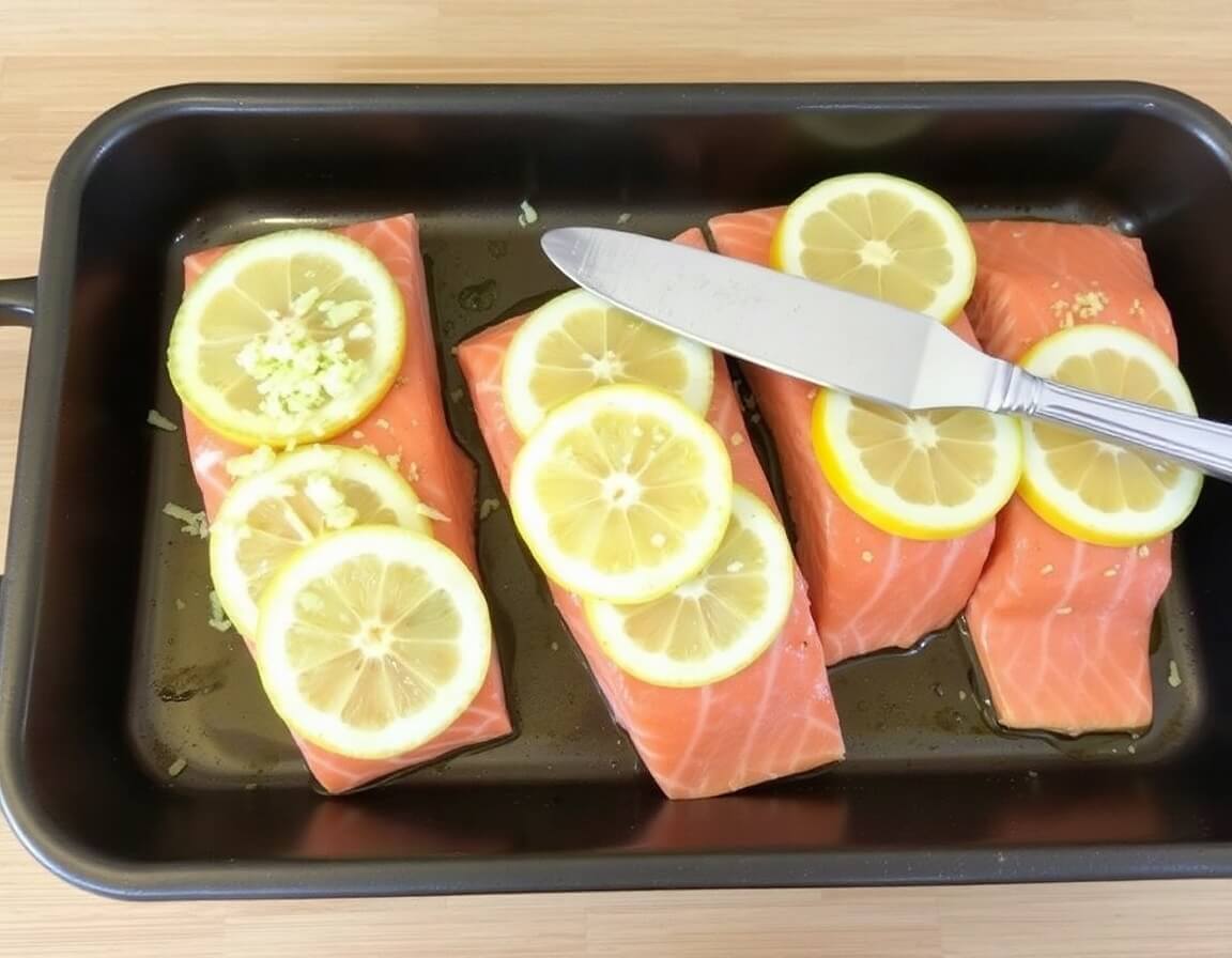 Spread the minced garlic across the salmon. Layer lemon slices on top of each fillet and drizzle the lemon juice over them.