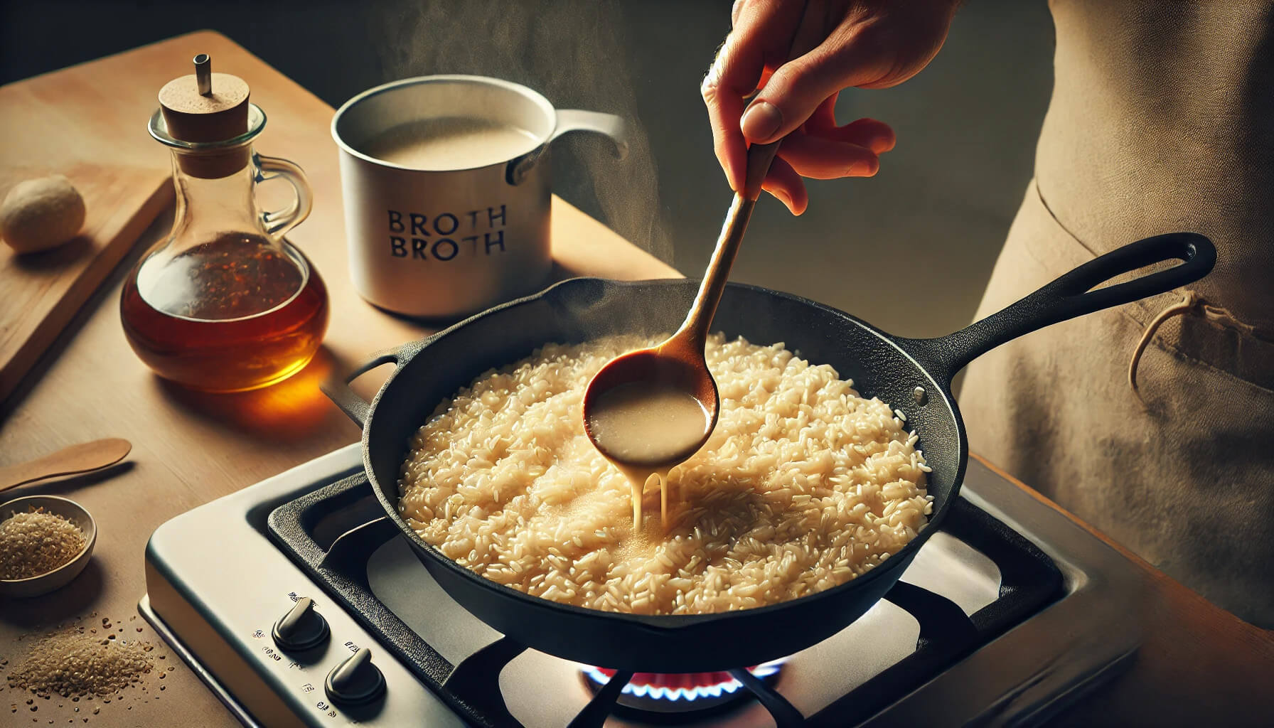 - Pour in about 1/2 cup of the warm broth and stir the rice until the broth is mostly absorbed.