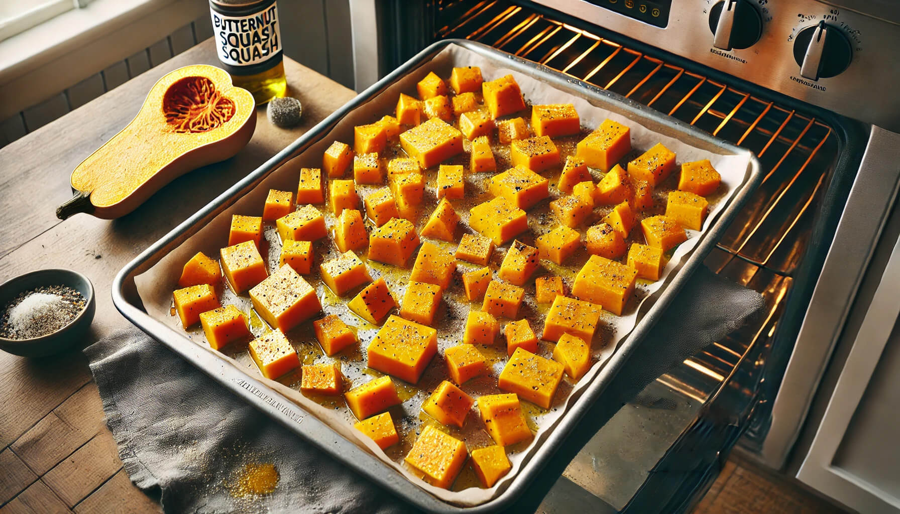 - Place the cubed butternut squash on a baking sheet, drizzle with 1 tablespoon of olive oil, and sprinkle with a pinch of salt and pepper.