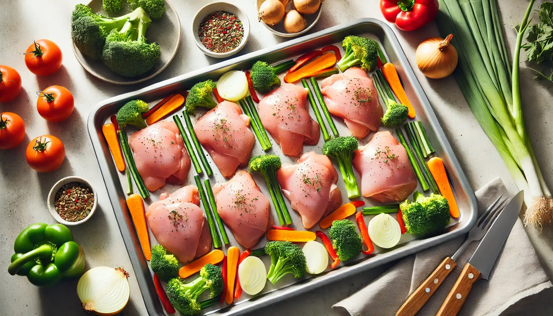 Place the chicken thighs (or breasts) on the sheet pan, nestled among the vegetables.