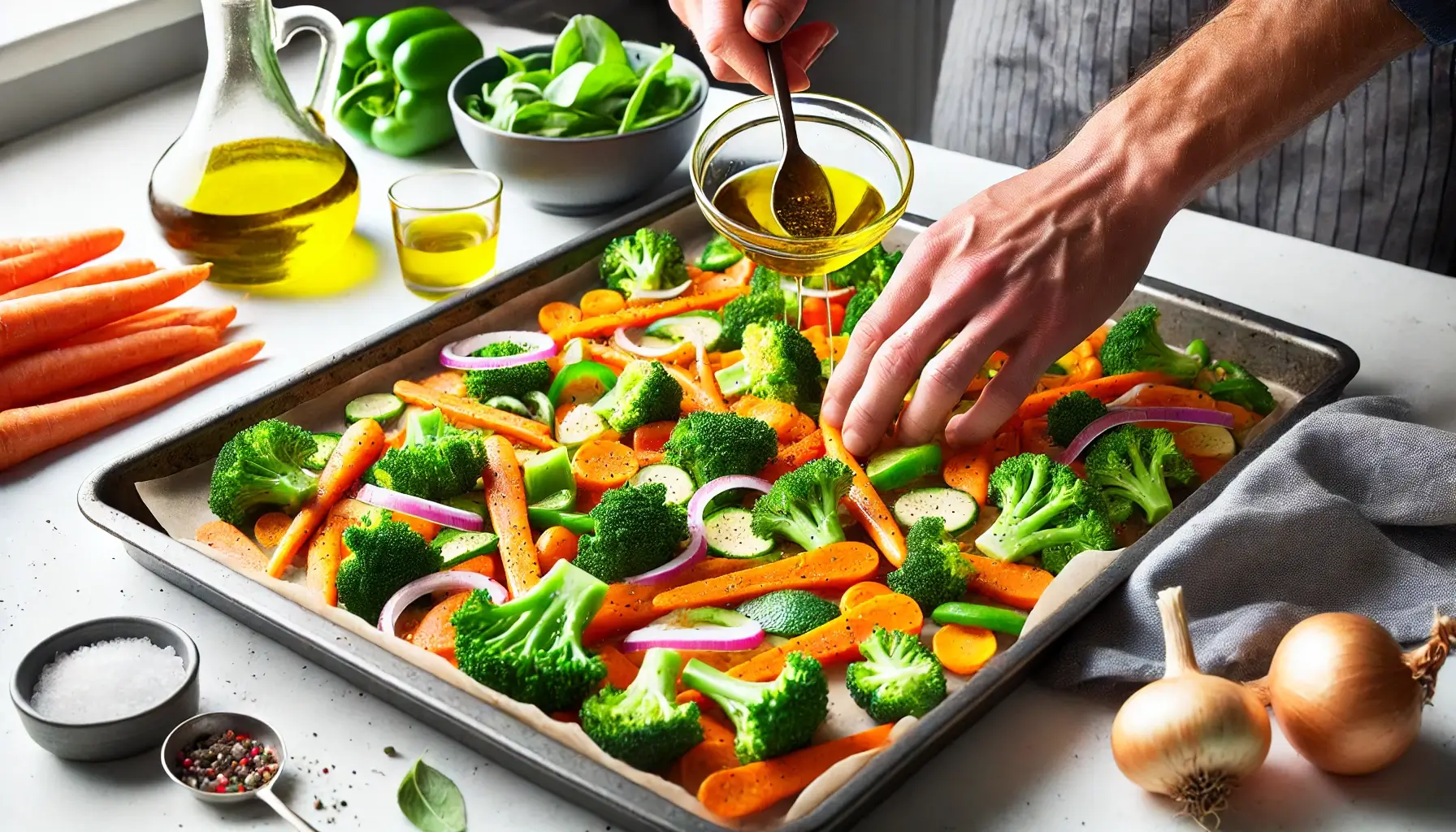 Place the broccoli, carrots, bell peppers, and onion on the sheet pan.