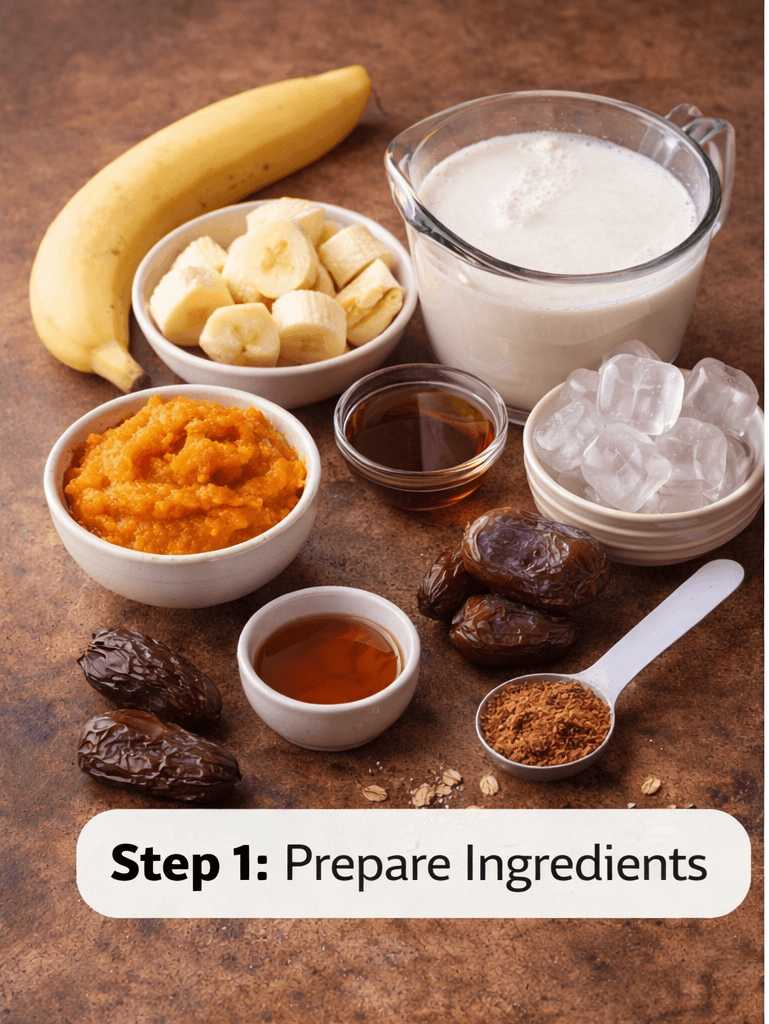 Measure out all your ingredients. If using fresh banana, peel it. If using dates for sweetener, pit them first. Make sure pumpkin puree is well-stirred if using canned.