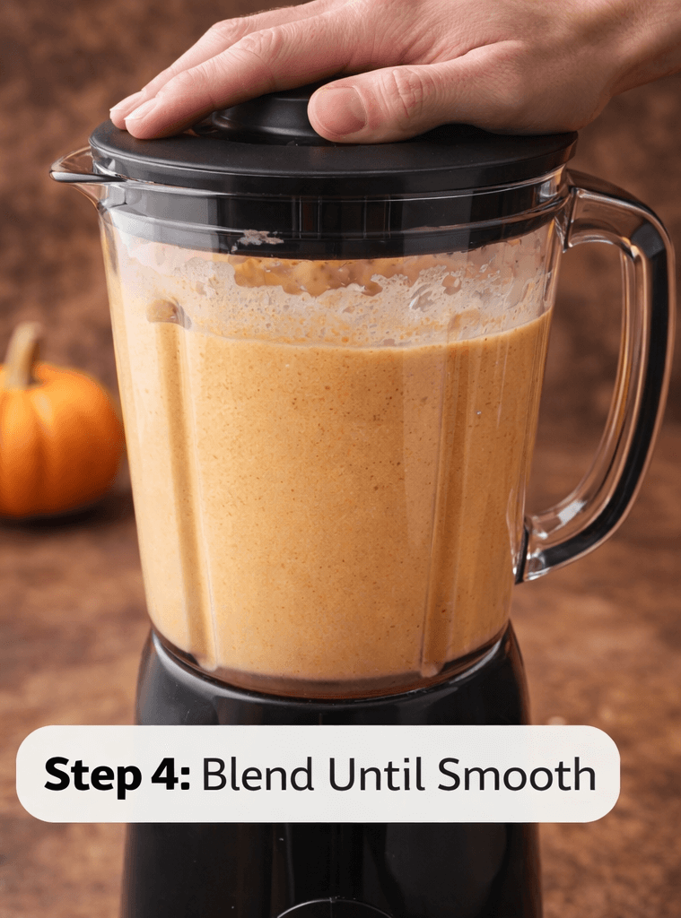 Add the pumpkin puree, banana, pumpkin pie spice, vanilla extract, maple syrup (or dates), and ice cubes to the blender. If using any optional add-ins like Greek yogurt or protein powder, add them now.