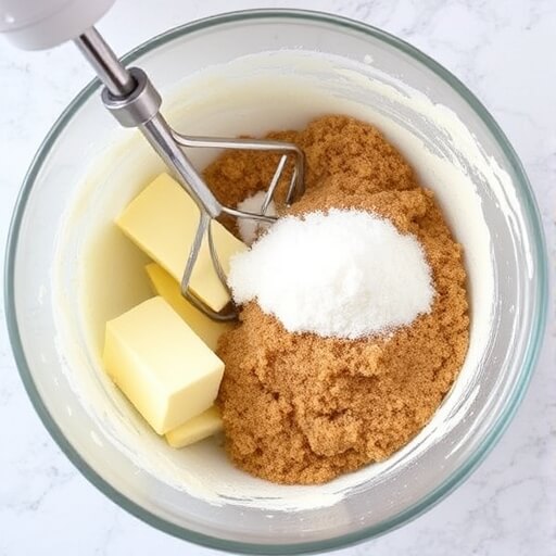 In a large mixing bowl, use a hand mixer or stand mixer to beat the softened butter, granulated sugar, and brown sugar together until light and fluffy. This usually takes about 2-3 minutes.